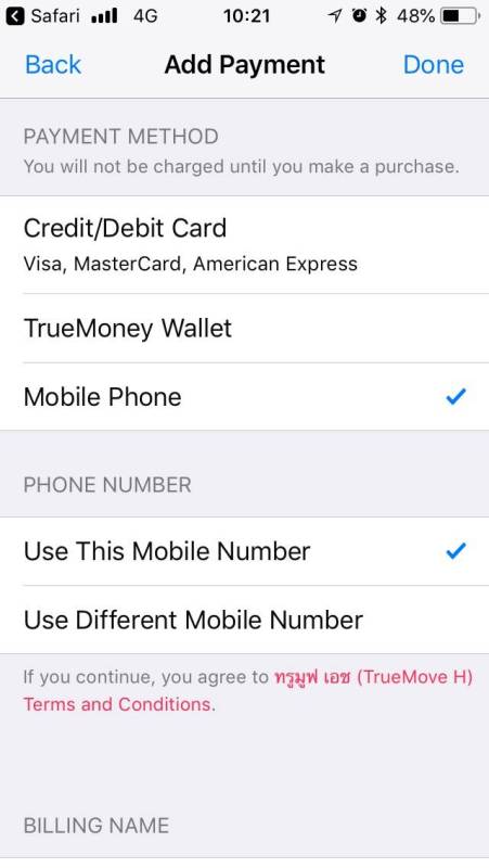 เลือกว่าจะจ่ายเงินจากอะไร ด้านล่างเลือก จ่ายจากหมายเลขโทรศัพท์ของเรา แล้วคลิ้ก Done