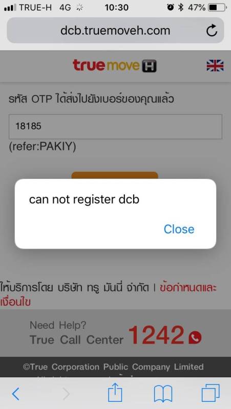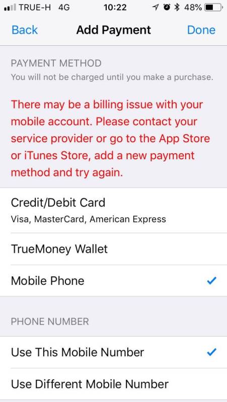 สุดท้ายก็ไม่ได้ บอกให้ติดต่อผู้ให้บริการ หรือลองเปลี่ยนวิธีการชำระเงินแล้วกลับมาเลือกแบบจ่ายแบบพร้อมบิลโทรศัพท์ก็ไม่ได้เหมือนเดิม