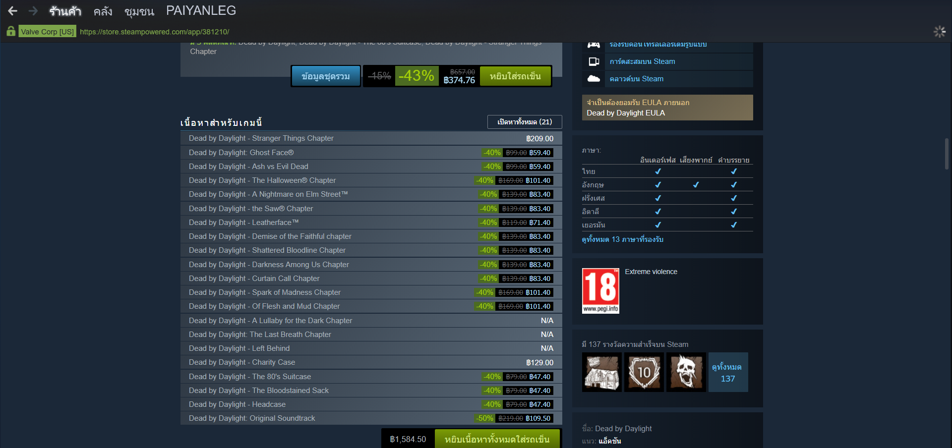 ส่วน DBD ส่วนใหญ่มักไม่เกิน 200 บาทก็ได้ตัวละครใหม่แล้ว (ไม่แน่ใจว่าแค่ Stranger Things 209 บาท ก็จะได้แค่ 1 ตัวละคร หรือได้ 3 ตัวละครเลยรึเปล่า ซึ่งทำให้ดูถูกกว่าเข้าไปอีก)