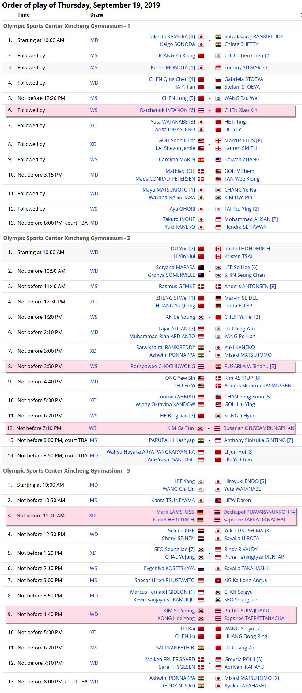 • โปรแกรม/ผลการแข่งขันทั้งหมด รอบ 16 คน (19 ก.ย. 62) [เวลาทางจีน เร็วกว่าไทย 1 ชม.]