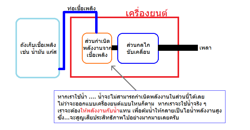 แปลงพลังงานจากเชื้อเพลิงไปเป็นการหมุนของแกนเพลา .... แต่ หากเราใช้น้ำ น้ำเป็นสิ่งที่ไม่สามารถ