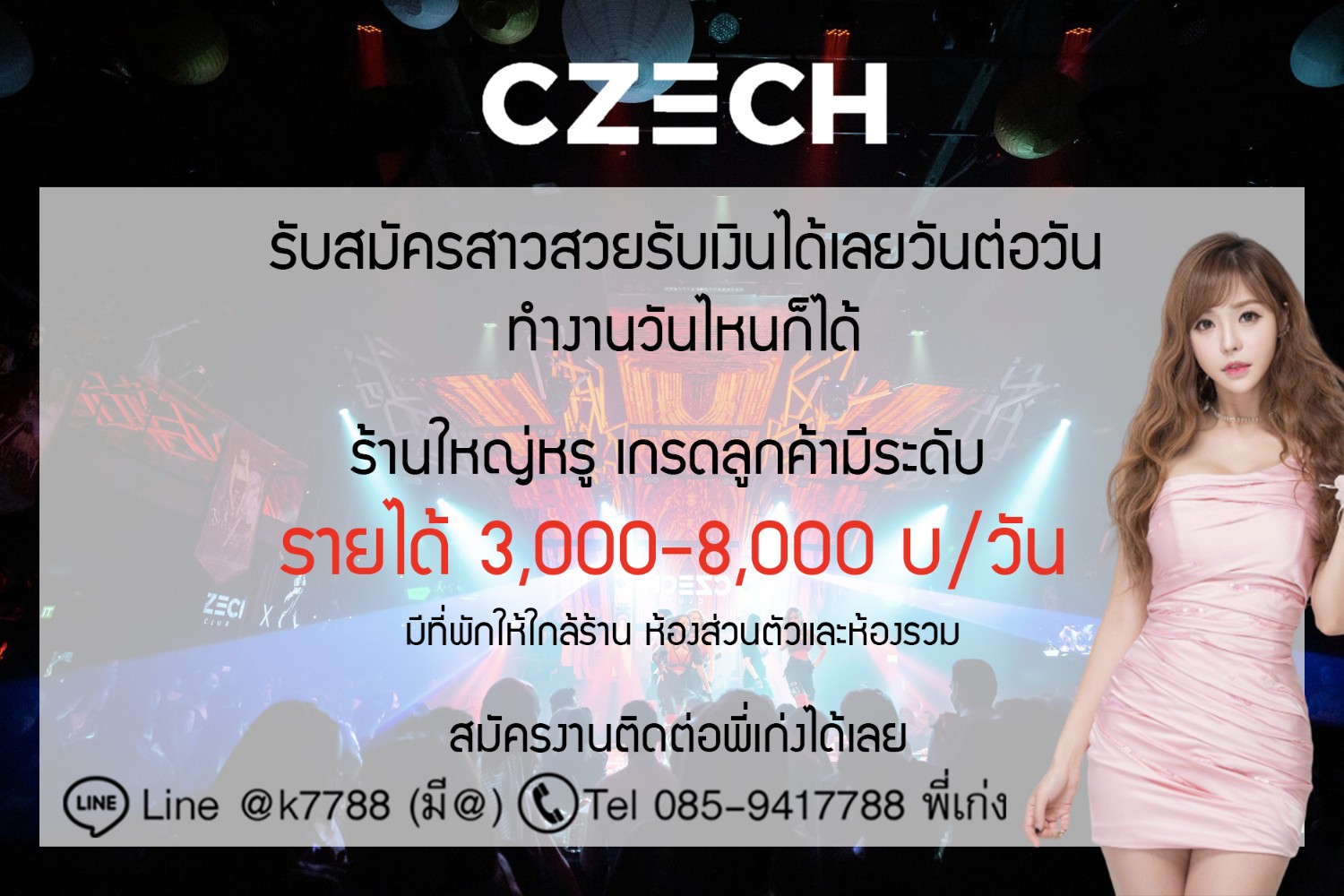 Czech Club คลับหรูย่านเอกมัย รับสมัครพริตตี้สาวสวย รายได้วันละ 3,000-8,000 บาท ตอนนี้ให้สตาร์ทสูงถึง 7 ดื่ม 320 บาทเลยน้า