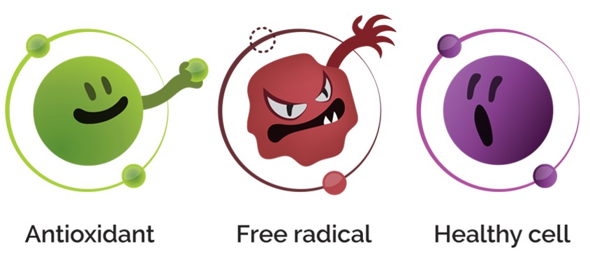 Antioxidant ต่อต้านอนุมูลอิสระ (free radical) ส่งผลให้เซลล์มีสุขภาพดี