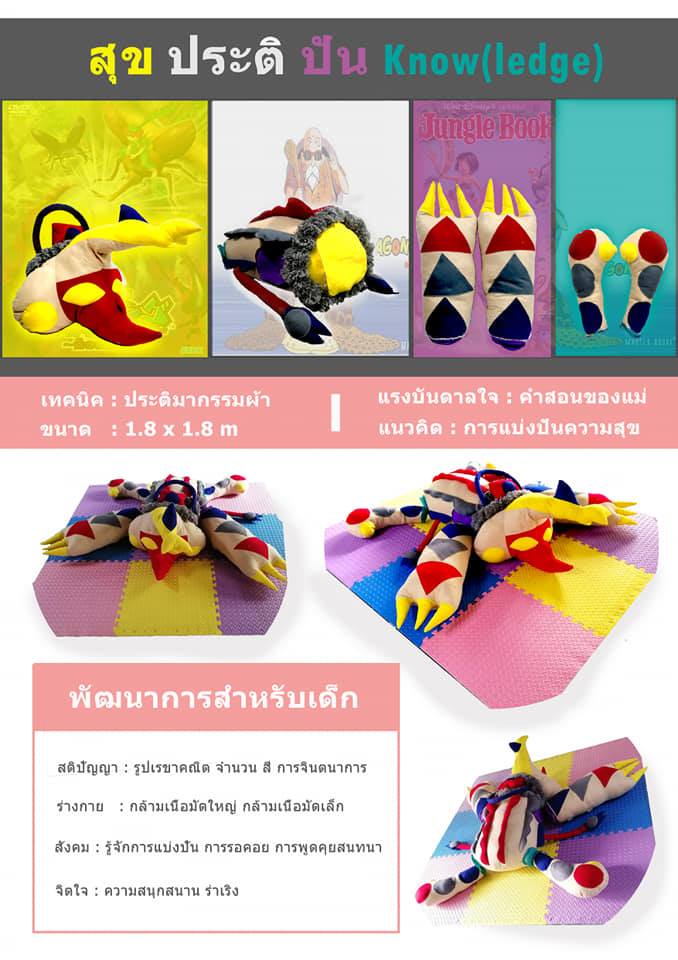 โดยภาพรวมของเล่นที่ทำจากผ้าเหมาะสมกับเด็กประถมวัย มีความปลอดภัย เสริมสร้างพัฒนาการด้านต่างๆ สามารถสื่อถึงความสุขของผู้ที่ได้รับในสิ่งที่ไม่เคยได้รับมาก่อนและยังสามารถเติมเต็มส่วนที่ขาดหายไปจากความทรงจำในวัยเด็กของผู้สร้างสรรค์ได้ และยังสามารถกระตุ้นความทรงจำเกี่ยวกับการ์ตูนที่ได้ดูในวัยเด็กของผู้ที่มาชมผลงาน ซึ่งเป็นไปตามจุดประสงค์ที่ตั้งไว้ของผู้สร้างสรรค์