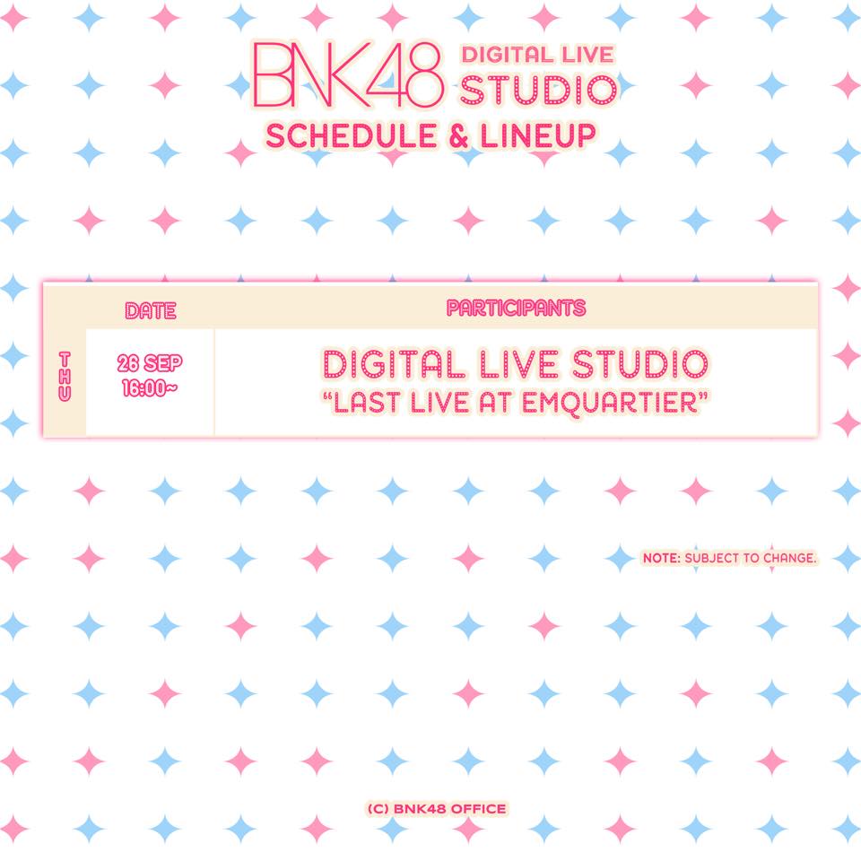 ประกาศ DIGITAL LIVE STUDIO ประจำวันที่ 18 กันยายน 2563 เวลา 18:00 น. ที่หน้าเพจ BNK48 OFFICIAL โดยมีสมาชิกที่เข้าร่วมดังนี้