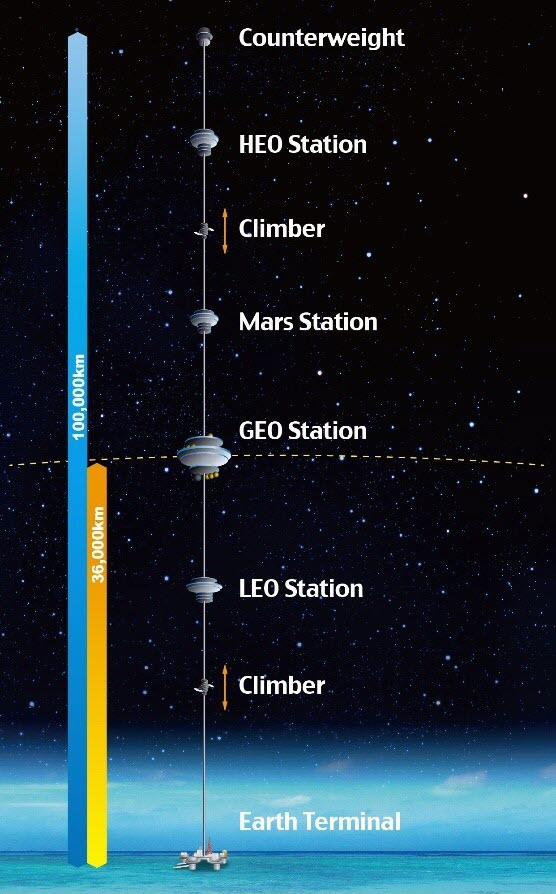 ด้วยการทำงานแบบลิฟต์ ในการยกของจากพื้นโลกไปยังสถานีปลายทางที่วงโคจร geosynchronous orbit ซึ่งสูงจากพื้นโลก 42,000 กิโลเมตร (GEO Station)