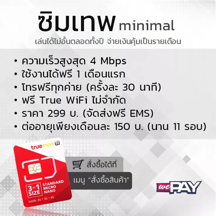 ขอรายละเอียดโปรซิมเทพ มินิมอล 4Mb เดือนแรก 299 บาท เดือนถัดไป 150 บาท