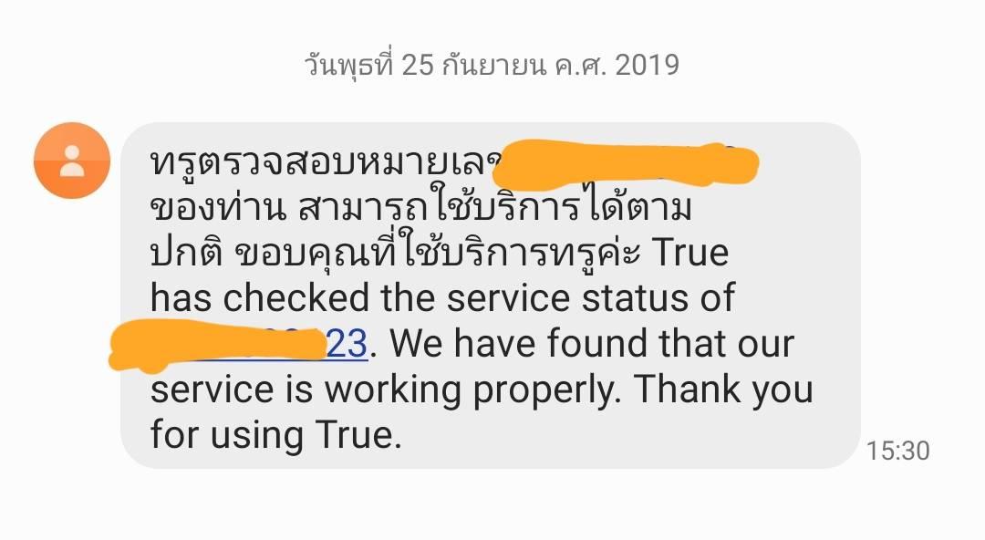 จากที่ได้รับคำตอบจากเจ้าหน้าที่ผ่นหลังไมค์ว่าจะมีช่างเข้ามาในวันที่ 25 กย 62 เวลาไม่เกิน 17.00 น. และแล้วก็มี sms จากทรูว่า internet ของท่านใช้งานได้ปกติ ทั้งๆที่ยังไม่มีใครโทรมาและยังไม่ได้เปิดบ้านให้เช็ค แบบนี้คืออะไร