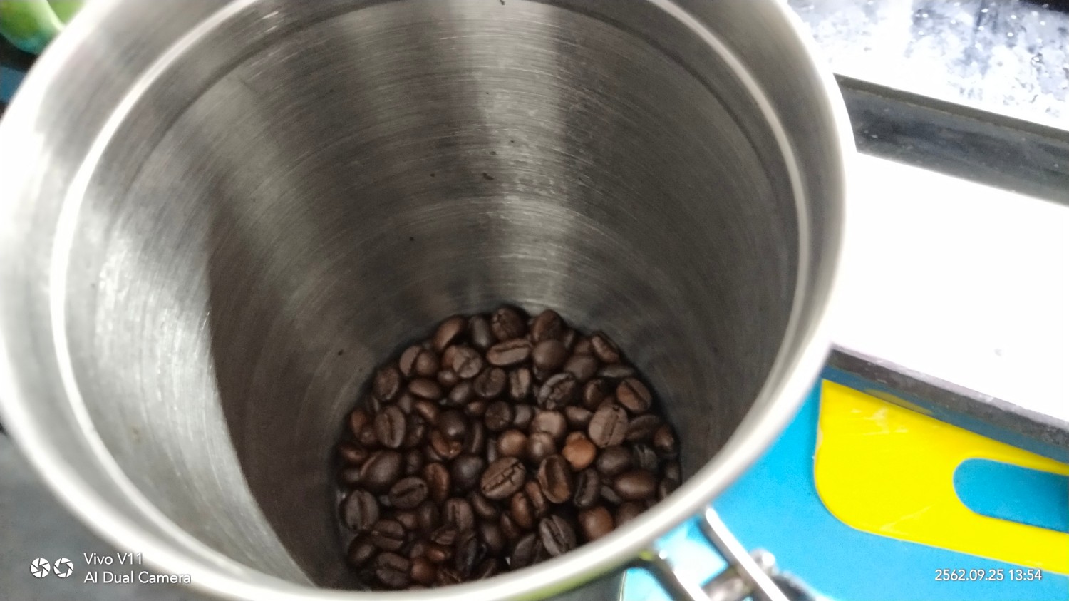 1.เริ่มจากเมล็ดกาแฟที่ชอบอันนี้แต่ความชอบเลยครับเตรียมเอามาบดด้วยเครื่อง จากเคยใช้หมุนมันก็ได้อารมณ์ดี เดี๋ยวนี้ขี้เกียจใช้เครื่องบดแล้วกันครับ 555