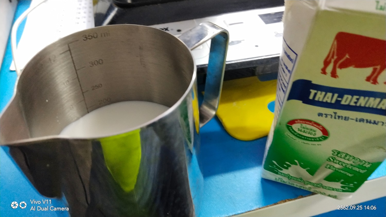 12.คราวนี้เตรียมเป่าฟองนมครับ เทนมใส่เหยือกเป่า