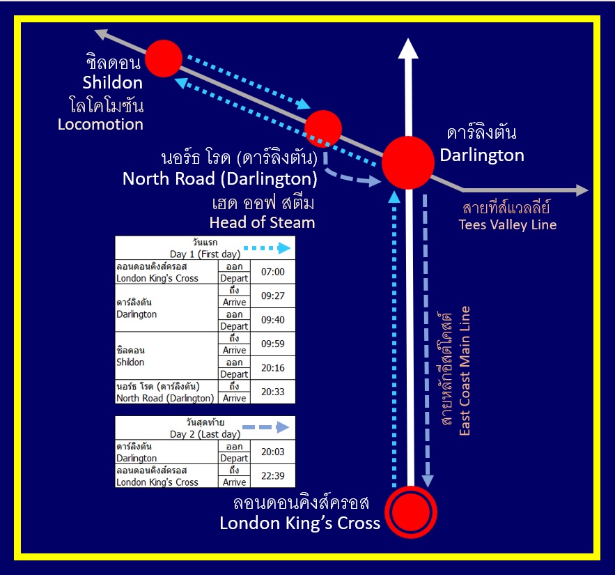 สำหรับสถานที่จัดกิจกรรมนั้น อยู่ที่เมืองชิลดอน (Shildon) ซึ่งอยู่ห่างจากกรุงลอนดอนประมาณ 400 กิโลเมตร เนื่องจากช่วงวันหยุดเสาร์-อาทิตย์ไม่มีฝึกงาน ผมจึงจองตั๋วแล้วเริ่มวางแผนการเดินทาง