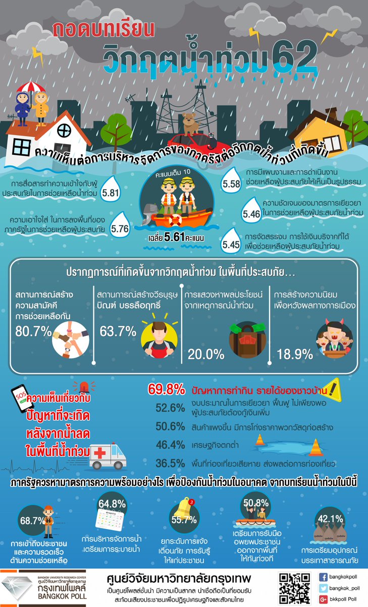 ถอดบทเรียนวิกฤตน้ำท่วม 62” โดยเก็บข้อมูลกับประชาชนจากทุกภูมิภาคทั่วประเทศจำนวน 1,189 คน ระหว่างวันที่ 24-26 ก.ย.ที่ผ่านมา พบว่า ประชาชนให้คะแนนภาพรวมการบริหารจัดการของภาครัฐต่อวิกฤตน้ำท่วม 5.61 จากคะแนนเต็ม 10