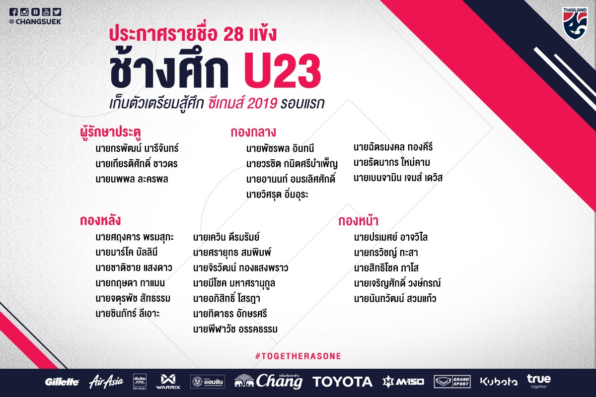 รายชื่อ 28 แข้ง ช้างศึก U23 เก็บตัวเตรียมสู้ศึก ซีเกมส์ 2019 รอบแรก