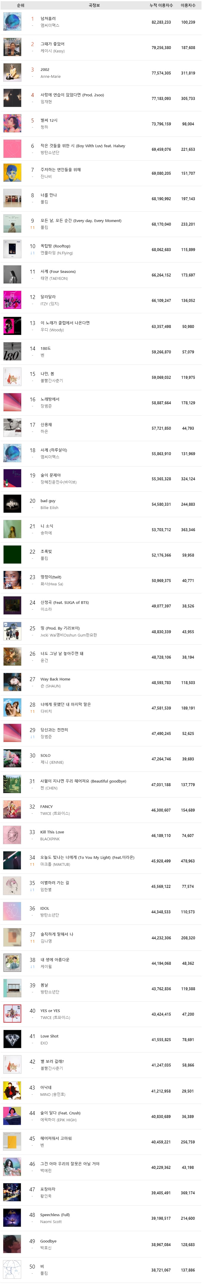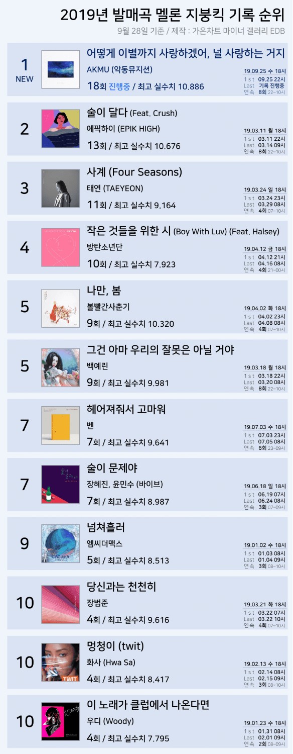 [Kpop] อันดับยอดสะสม unique listeners ของ melon 2019 + สถิติเพลงที่ทำ Rooftop Hits ชาร์ต Melon 2019