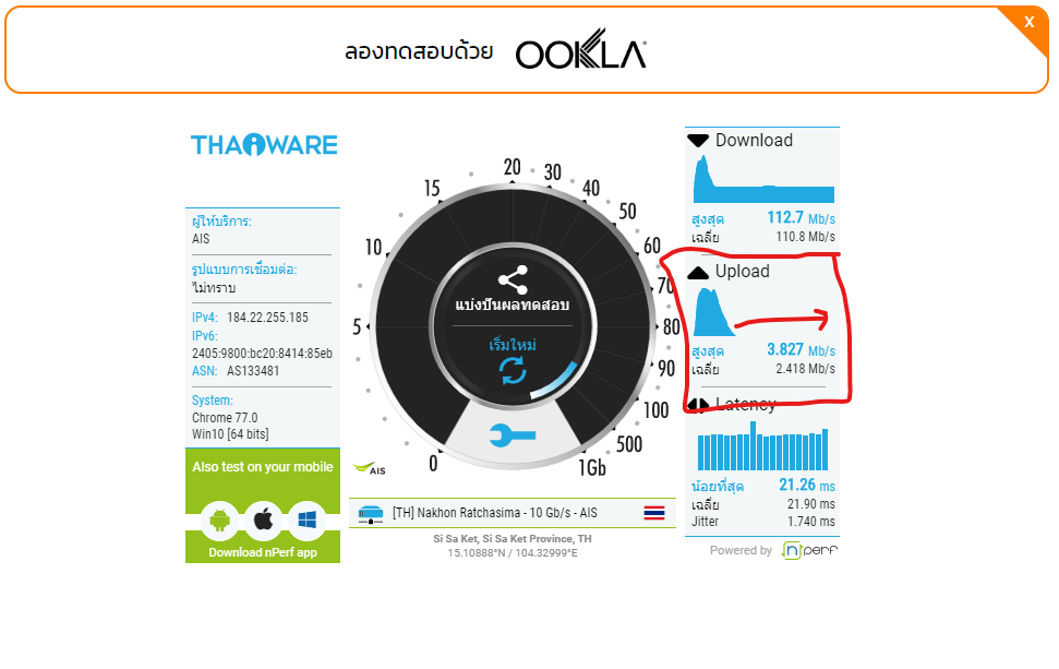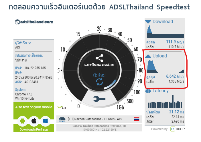 ใช้งาน แพ็คเกจ Ais fibre 100/700 ทำงานผ่านสาย lan speedtest อยู่ที่ 700 ปลายๆ up load อยู่ที่ 600 ปลายๆ ลองเทสผ่าน มือถือ iphone 11 Promax ได้อยู่ที่ 400 ปลายๆ upload อยู่ที่ 100 ปลายๆ ล