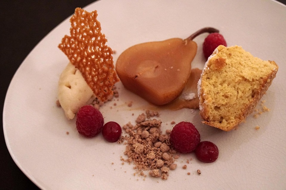 ลูกแพร์ทานกับซูเฟลน้ำผึ้ง ครัมเบิ้ล ผลราสเบอร์รี่ ราสเบอร์รี่เจล ไอศกรีมน้ำผึ้ง ลูกแพร์รสชาติดี นุ่ม ไม่มีกลิ่น ไม่หวานจนเกินไป ทานตัดกับผลไม้รสเปรี้ยวได้ดี (14/20)