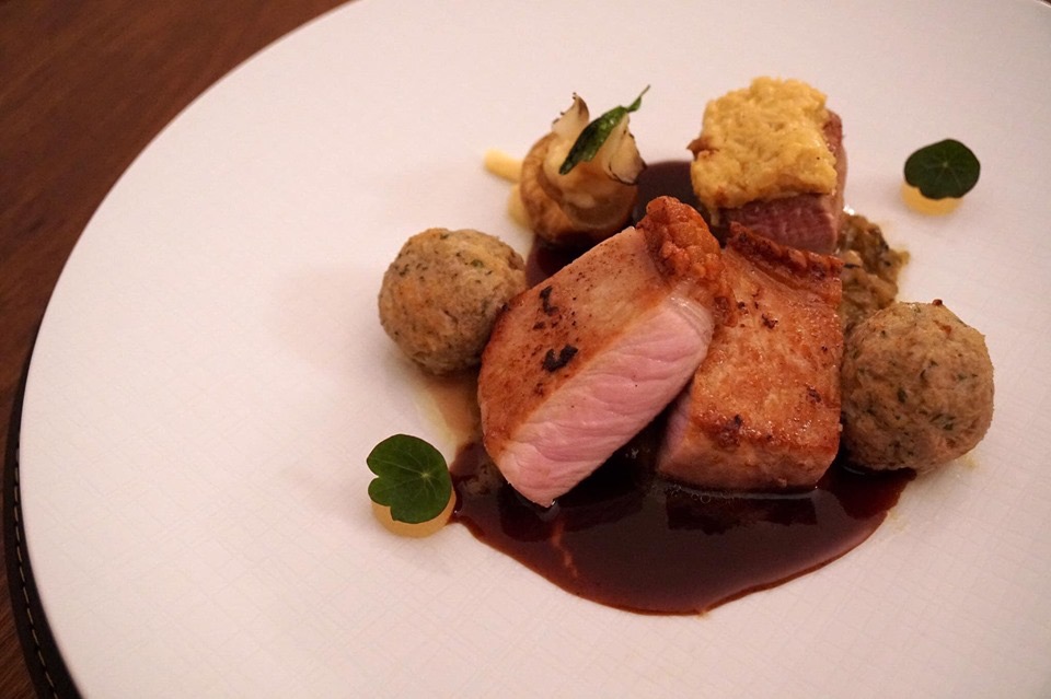 ส่วนหลังของหมูดูร็อค นำไปย่างจนหนังกรอบ เเต่เนื้อข้างในยังฉ่ำนุ่ม จานนี้ต้องบอกเลยว่าโดดเด่นเเละอร่อยมาก ดีกว่าหมูดำคุโรบุตะเสียอีก ราดด้วยน้ำซอสรสเข้มข้น ทานกับเกี๊ยวที่รสชาติเหมือนลูกชิ้นหมู และสมุนไพรท้องถิ่นของเเคว้นบาวาเรีย (15/20)