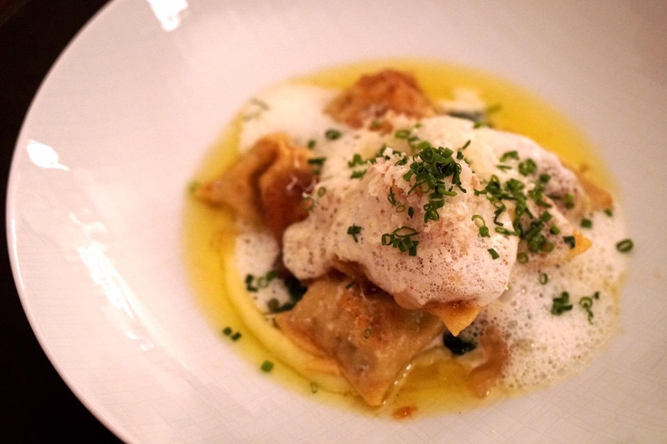 Mountain Ravioli หรือเกี๊ยวทอดแบบบาวาเรีย ด้านในสอดไส้เนื้อสับ ทอดจนแป้งมีสีเหลือง ทานกับหอมเผาและอาร์มชีสเนื้อนุ่ม (12/20)