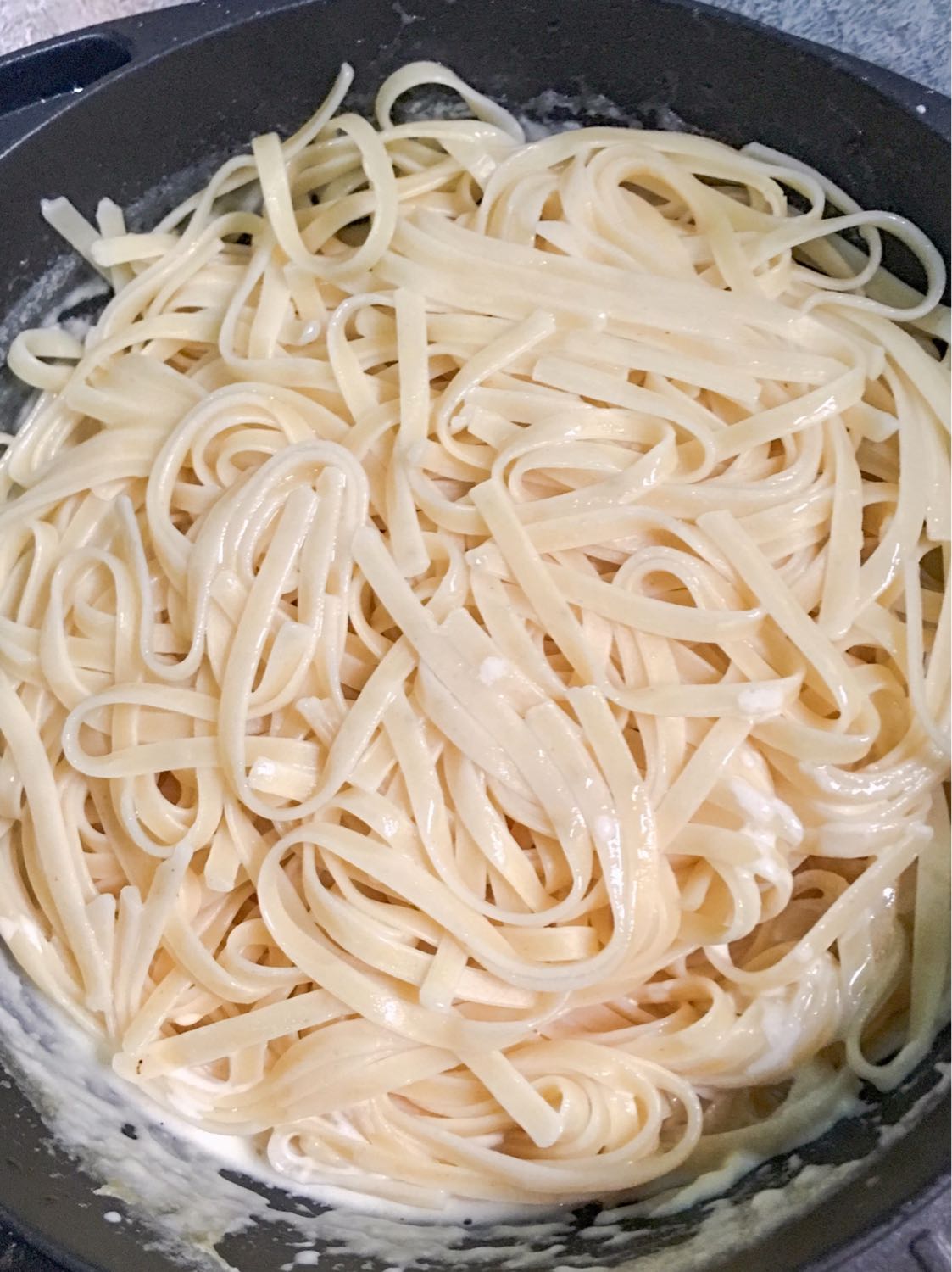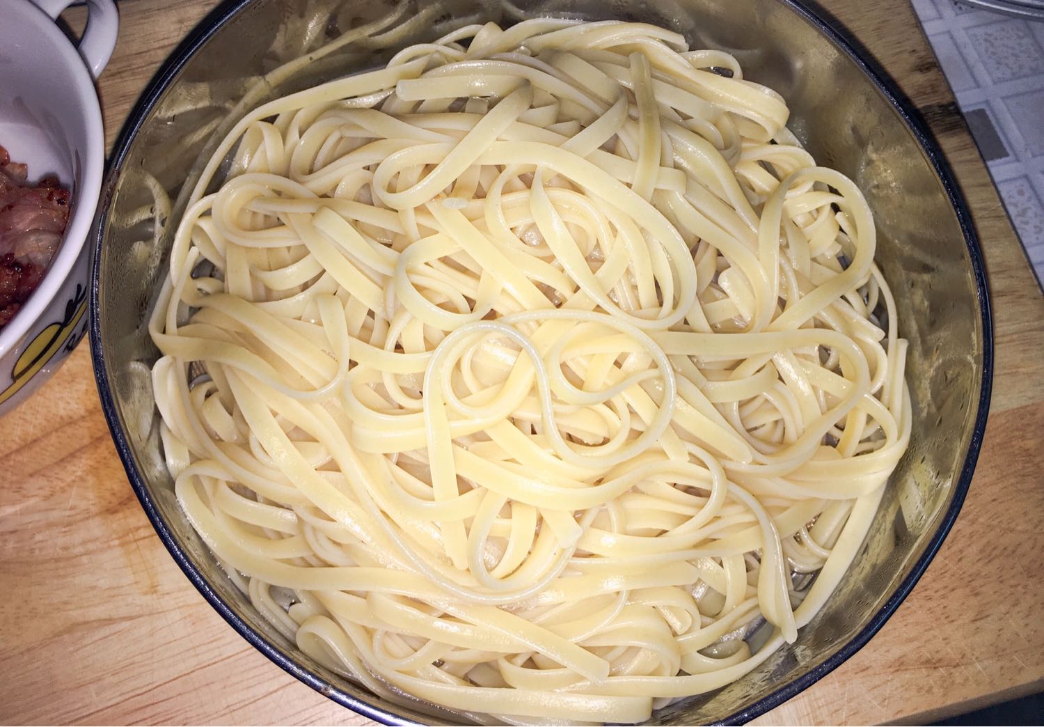 7.คนเส้นสปาเก็ตตี้และเบค่อนที่เตรียมไว้ตอนต้น ผสมกับครีมที่เตรียมไว้