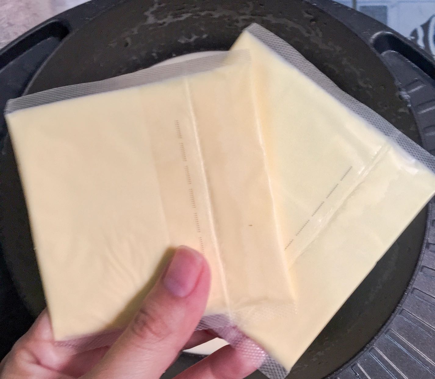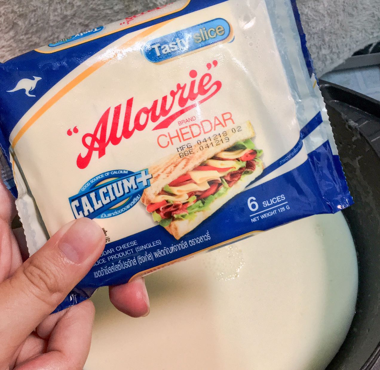 -ชีสแผ่น 2 แผ่น (ปกติตามสูตรจะใช้ เชดด้าชีส พาเมซาน หรือชีทชนิดอื่นตามแต่สะดวก)