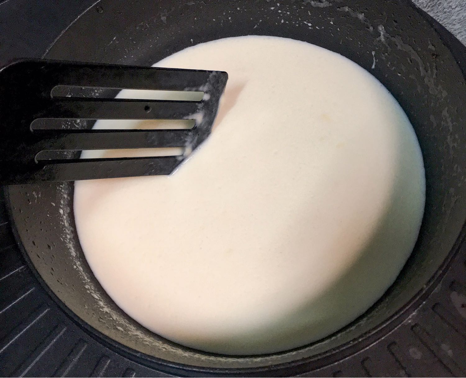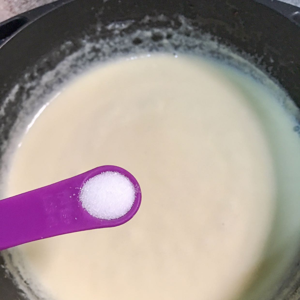 5.ตั้งนมในน้ำเดือด ใส่ชีทแผ่นลงไปคนจนชีทละลายเป็นเนื้อครีม
