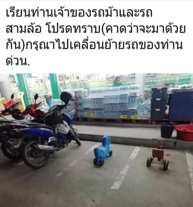 เป็นเรื่องราวที่เรียกเสียงหัวเราะปนความน่ารักได้เป็นอย่างมากเมื่อมีคนถ่ายภาพลักษณะเป็นรถของเล่นจอดอยู่หน้าเซเว่น โดยมีผู้ใช้เฟสบุ๊คท่านหนึ่งได้โพสต์ภาพดังกล่าวที่ระบุข้อความว่า เรียนเจ้าของรถม้าและรถสามล้อ โปรดทราบคาดว่าจะมาด้วยกัน กรุณาเคลื่อนย้ายรถของท่านด่วน