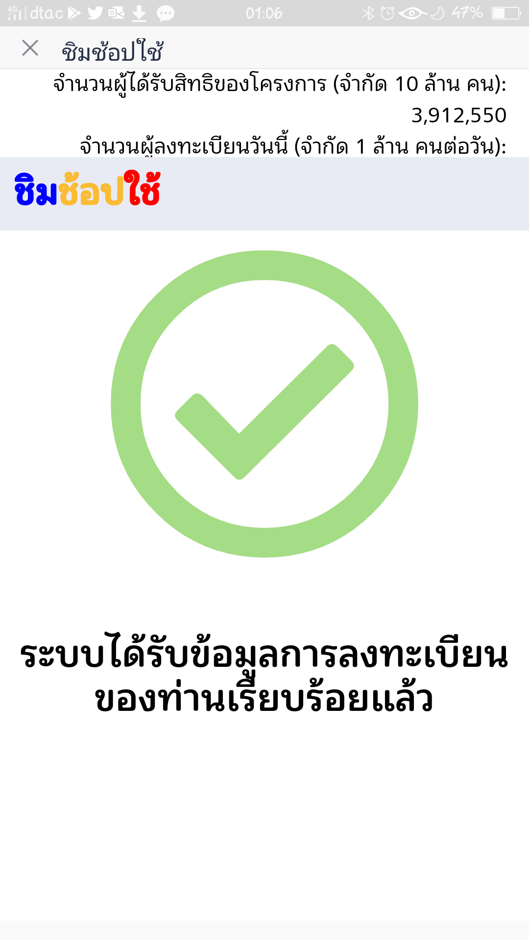 #ชิมช้อปใช้ มีใครได้รับsmsยืนยันลงทะเบียนสำเร็จแล้วบ้างครับ