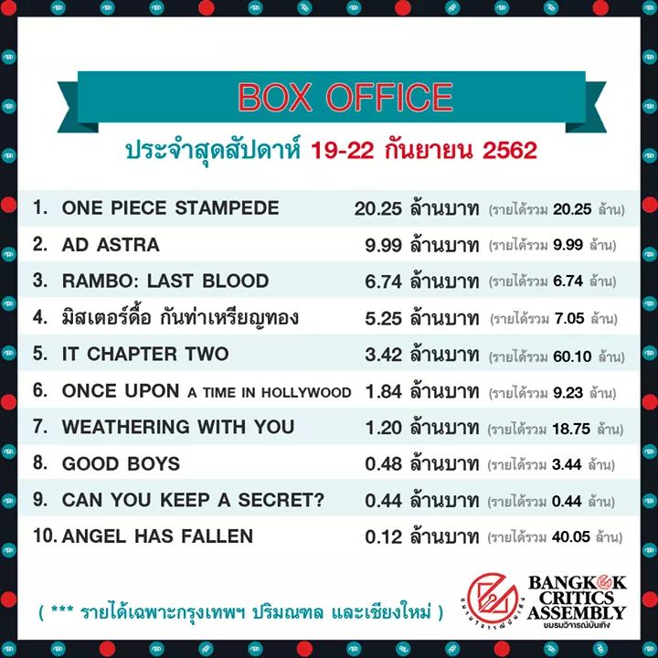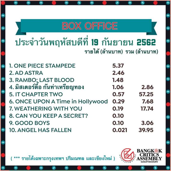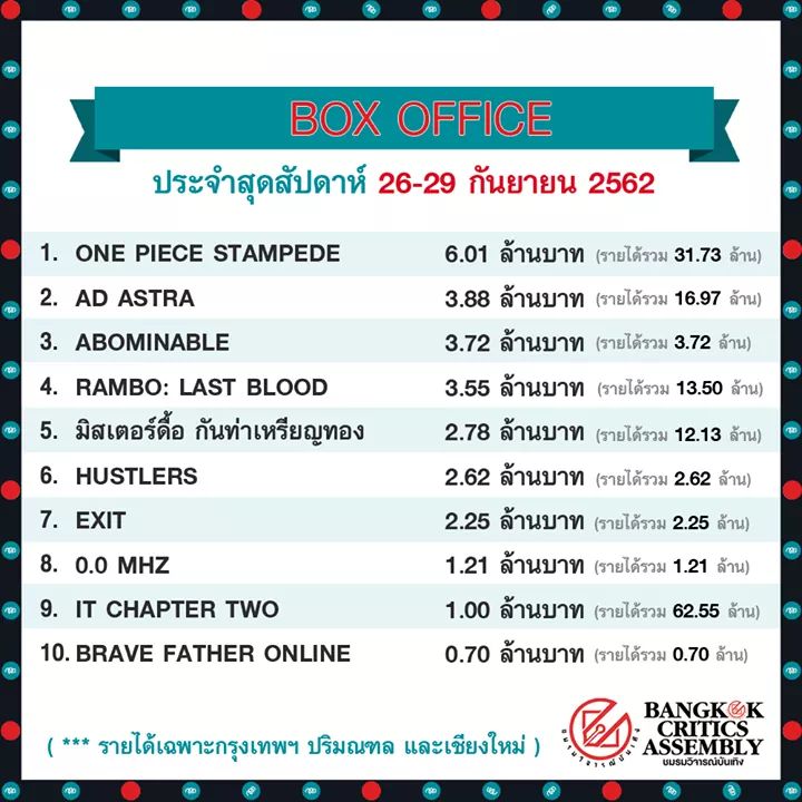 แถมยังติดอันดับ 1 ของภาพยนตร์ Box office ทำเงินสูงถึง 4 ครั้งซ้อนนับตั้งแต่วันแรกที่เริ่มฉายอีกด้วย