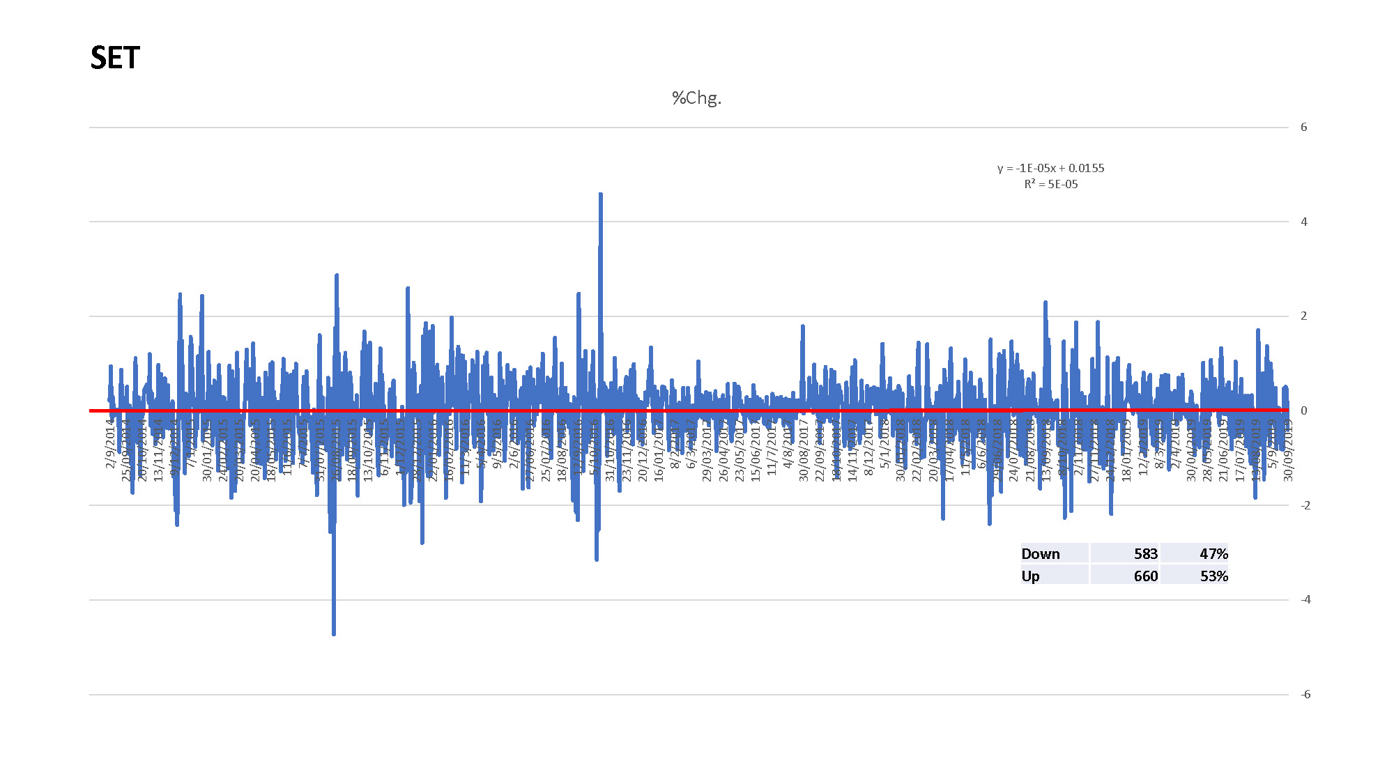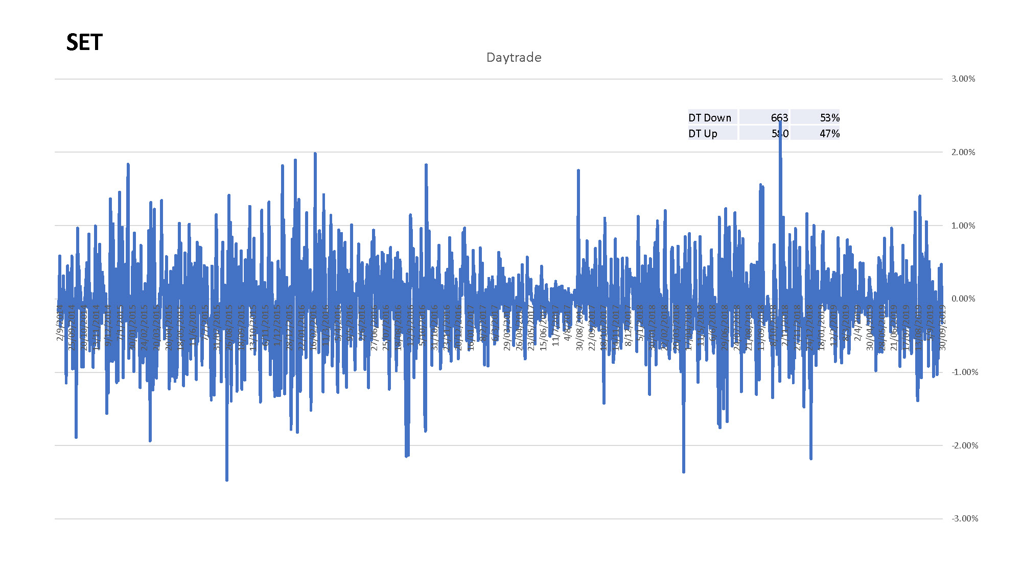 สรุป chart ปู่ SET พบว่าการคาดเดาว่าหุ้นขึ้นหรือลงในแต่ละวันเป็นการพนันดีๆนี่เอง