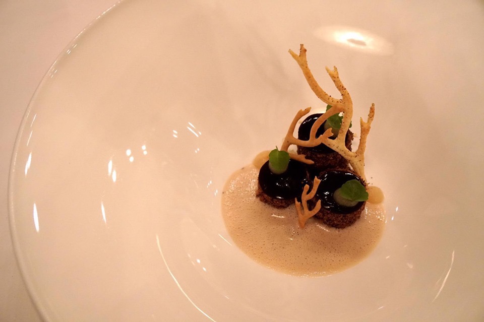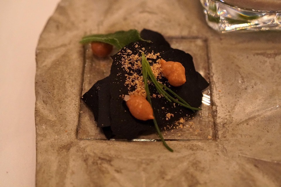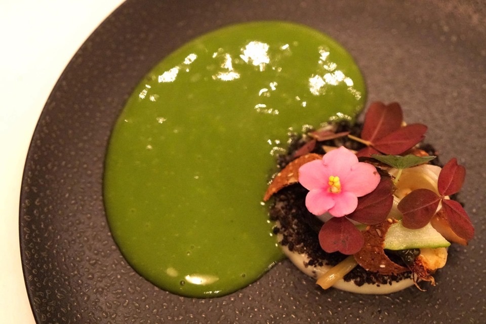 🥗 สำหรับจานแรกคือ Variation of asparagus เริ่มจากเพียวเรหน่อไม้ฝรั่งผสมกับรสชาติของใบมะกรูด สีดำด้านบนคือผงทำจากหมึกดำและเห็ด แผ่นกรอบทำจากกระเทียมป่า และซอสพาสลีย์สีเขียว ลูกเล่นของจานนี้คือรสเปรี้ยวของหน่อไม้ฝรั่งดองที่ตัดกับรสหวานของเพียวเรพาสลีย์เนื้อเนียน แม้ว่ารสชาติออกมาอยู่ในเกณฑ์ใช้ได้ แต่ยังไม่ว้าวมากนักสำหรับร้านระดับสองดาว (14/20)