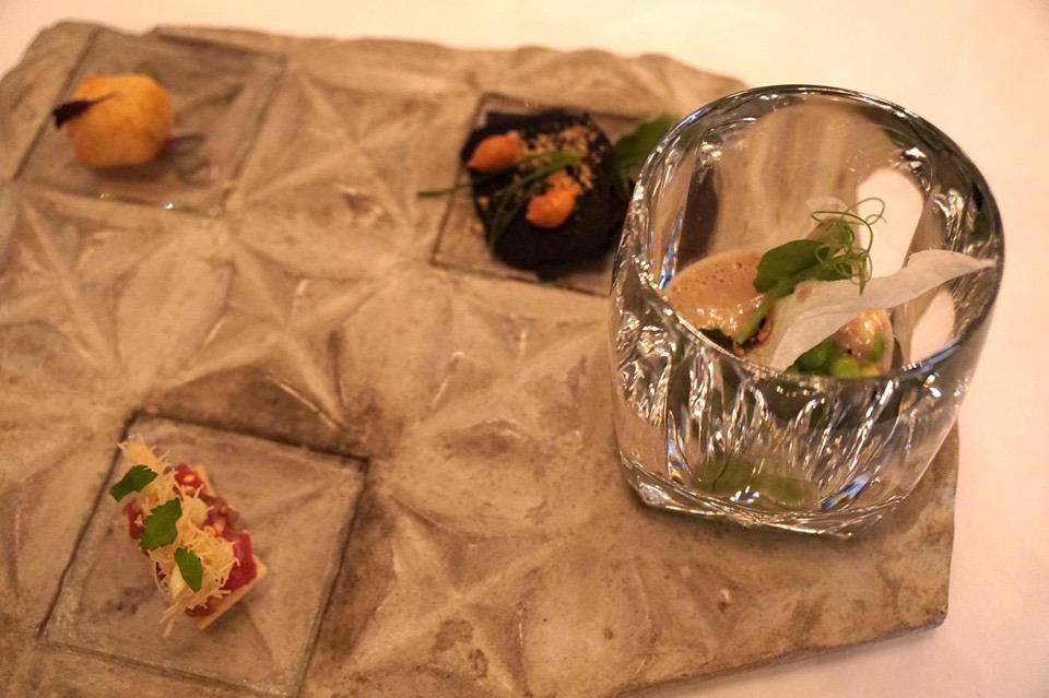 🍴 อมูสบูชสี่อย่างเสิร์ฟมาในแผ่นหินขนาดเล็ก รสชาติไม่แย่ เเต่ยังไม่ว้าวพอสำหรับร้านอาหารระดับ 2 ดาวมิชลิน