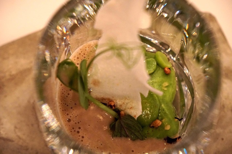 🌾 เพียวเรถั่ว ทานกับมิ้นท์และพาสลีย์ สีขาวด้านบนคือ rice chip หรือแผ่นกรอบทำจากข้าว มี mushroom powder หรือผงเห็ด และ mushroom velute (11/20)