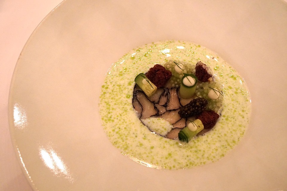 🐟 ปลาค็อดที่นำไปม้วนเป็นโรลำลมสวยงาม ทานเข้าไปจะมีเนื้อสัมผัสนุ่มอันเป็นเอกลักษณ์ธรรมชาติของปลาเนื้อขาว ทอปด้านบนด้วยไข่ปลาสเตอร์เจียนคาเวียเพื่อเพิ่มรสเค็ม ด้านบนมี Tapioca pearl เข้าใจว่าเชฟต้องการทำให้เกิด contrast ทางเนื้อสัมผัสของไข่มุกกลมที่ทำจากบุกกับไข่ปลาคาเวียเคี้ยวหนึบ เเต่เรามองว่าตัวบุกมันลดทอนเนื้อสัมผัสที่ดีและแพงของคาเวียออกไป ข้างๆมี Rice crouton กรอบๆ นอกจากนี้ยังมีเเตงกวากรอบม้วนเป็นทรงกระบอก ทอปด้านบนอีกทีด้วยเจลสีขาวทำจากบัตเตอร์มิลค์ ซอสสีขาวเช่นกันมีรสมันเค็มทำจากบัตเตอร์มิลค์และน้ำมันสีเขียวของผักชีลาว (15/20)
