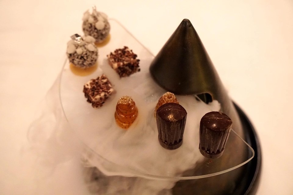 🍬 สำหรับเปอตีโฟว์ปิดท้ายมื้ออาหารประกอบไปด้วย โฮมเมดช็อกโกแลตสอดไส้ราสเบอร์รี่รูปหมวกเชฟ แมนดารินเจลลี่สีส้ม มาร์ชแมลโล่ทานกับโกโก้ มะพร้าวช็อกโกแลต (12/20)