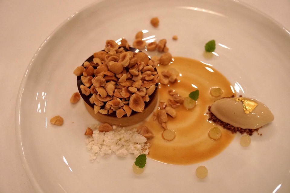 🍫 สำหรับของหวานวันนี้คือทาร์ตช็อกโกแลตและถั่วฮาเซลนัทจากปิเยมอนเต้ ประเทศอิตาลี โดยทางร้านจะนำไปคั่วแล้วเสิร์ฟมาร้อนๆ วางบนช็อกโกแลตจนละลายต่อหน้าลูกค้าดูน่าทาน ด้านข้างมีเจลเบอร์กามอต ผงเบอร์กามอต และไอศกรีมขนมปังบาเก็ตทอปด้วยทองคำเปลวทานได้และครัมเบิ้ลกรอบ (15/20)