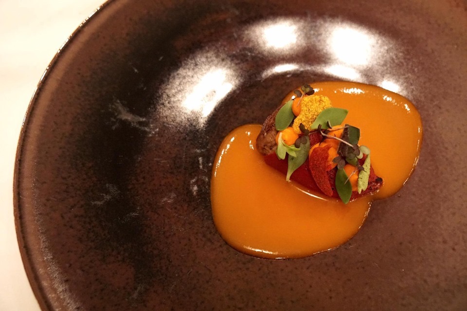 🦆 สุดยอดเมนูที่เสิร์ฟเป็น Extra course คู่กับ Wine paring 1 แก้ว คือตับเป็ดฮังการี สุดยอดวัตถุดิบเลอค่าจาก Duck Liver, Aszu & Top Chef Co. ทางร้านทำออกมาเป็นอาเต๊ะ เเต่มีการทวิสต์โดยการเพิ่มผงกาแฟเข้าไป ด้านบนเป็น Tonic base coffee gel หรือเเผ่นเจลกาแฟรสขม นอกจากนี้ยังมีเพียวเรรสเปรี้ยวหวานทำจากแอปเปิ้ลเขียว มี Marinated green apple cube หรือแอปเปิ้ลเขียวหั่นเต๋า แผ่นกรอบเเละมูสตับเป็ดสีเหลืองนวล โดยปาเต๊ะตับเป็ดที่ทางร้านทำออกมาได้สมกับเป็นวัตถุดิบระดับโลกจริงๆ เนื้อเนียน นุ่ม ไร้ซึ่งกลิ่นคาวเครื่องใน มีรสหวานอ่อน ตัดด้วยรสขมอ่อนๆ และกลิ่นของกาแฟเข้ากันดีมากๆ รสเปรี้ยวขององค์ประกอบของแอปเปิ้ลเขียวก็มีรสออกมาพอดีๆ ไม่กลบรสเเละเนื้อสัมผัสของตับเป็ด จานนี้ทุกอย่างถือว่าดีงามสุดๆจริงๆ และโดยรวมถือเป็นจานที่ดีที่สุดในค่ำคืนนี้ (16/20)