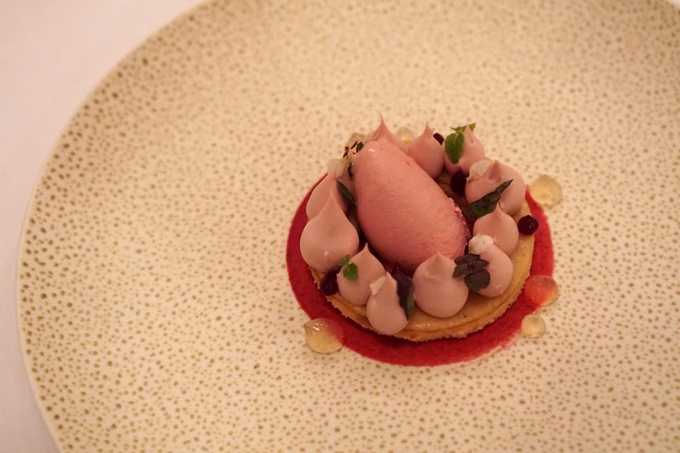 🍫 คอร์สก่อนของหวานเสิร์ฟมาเป็นสปอนเค้กเนื้อนุ่ม ไอศกรีมรูบี้ช็อกโกแลตสีชมพูพร้อมด้วยมูสเดียวกัน มีรสหวาน ทานกับเจลแบล็คเคอแรนท์รสเปรี้ยว และเจลดรอปคาโมมาย (14/20)