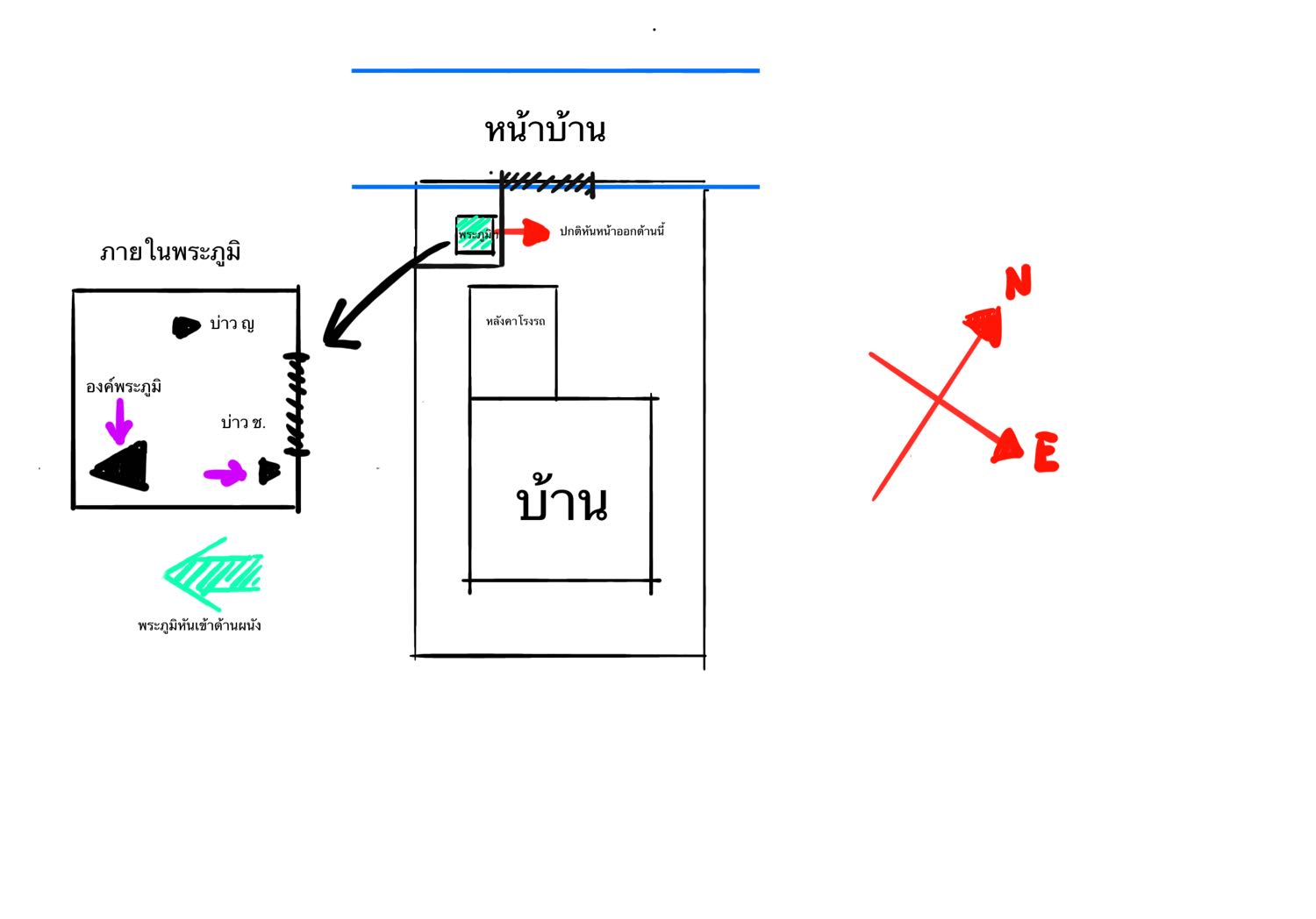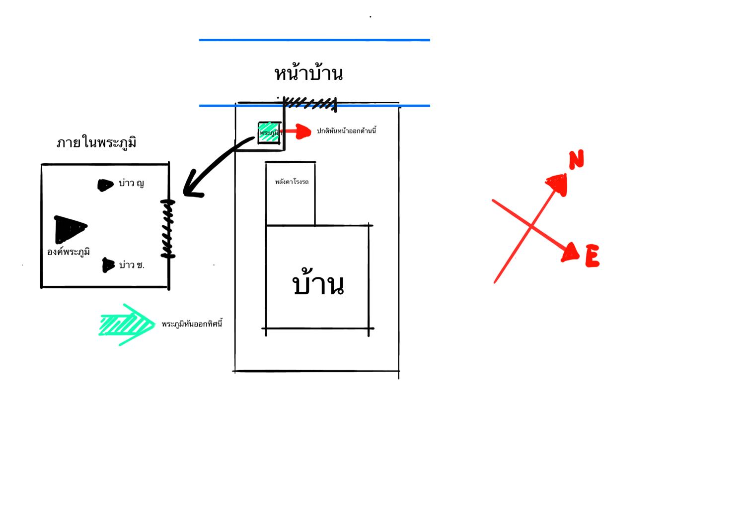 2. องค์พระภูมิ หันหน้าเข้าผนังด้านหลัง = ทิศ ตะวันตกเฉียงใต้