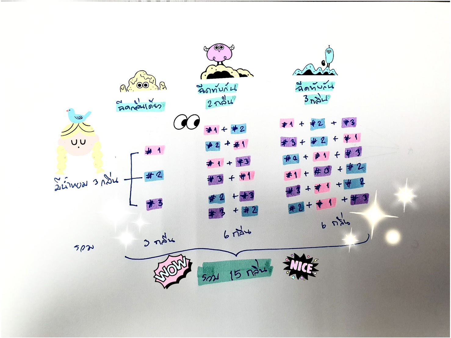 ถ้าลองทำแผนผัง ความน่าจะเป็นจาก 3 ขวดที่ซื้อมา สามารถทำได้ถึง 15 กลิ่นเลยนะ