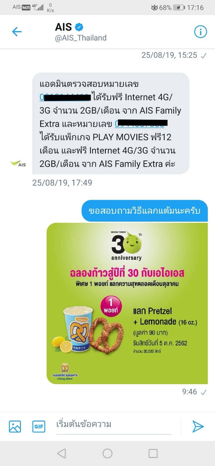 พอดีวันนี้ AIS มีโปรโมชั่นเอาแต้ม AIS POINT 1 แต้มไปแลกขนมได้ก็เลยอยากทราบวิธีแลกก็เลยส่งข้อความไปถามทาง