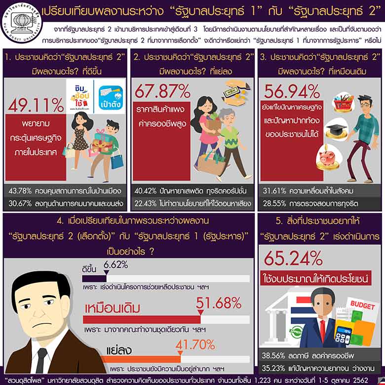 สวนดุสิตโพล” มหาวิทยาลัยสวนดุสิต ได้ทำการสำรวจความคิดเห็นประชาชนทั่วประเทศ จำนวนทั้งสิ้น 1,223 คน เปรียบเทียบผลงานระห่าง รัฐบาลประยุทธ์ 1 กับ รัฐบาลประยุทธ์ 2 ระหว่างวันที่1-5 ตุลาคม 2562