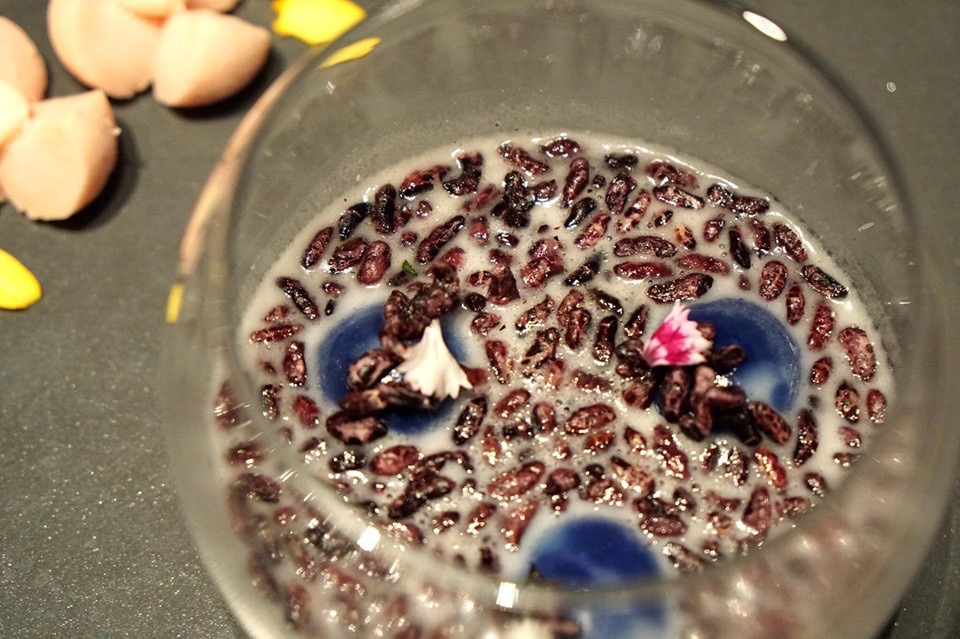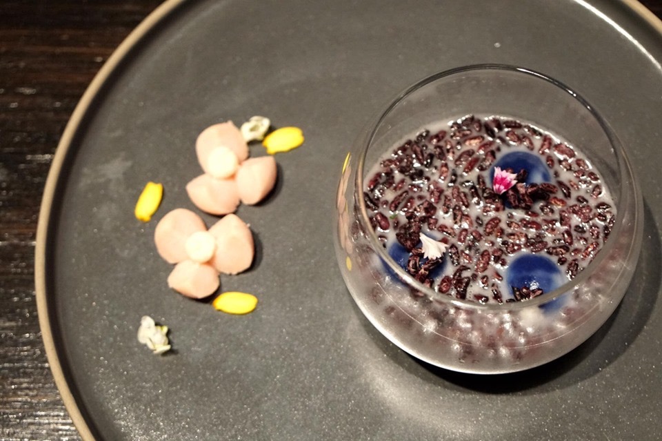 สำหรับของหวานอย่างแรกคือขนมโค หรือขนมพระพาย ขนมหวานคลาสสิคของภาคใต้ที่นำแป้งที่ใช้ทำขนมไปอบควันเทียนจนหอม แล้วสอดไส้มะพร้าวและกระฉีก เวลาเคี้ยวจะเหนียวหนึบคล้ายโมจิ ราดด้วยน้ำกะทิอบควันเทียนหวานหอม และข้าวพองสีน้ำตาลเข้มทำจากข้าวไรซ์เบอรี่ ที่ตัดเนื้อสัมผัสกับแป้งเหนียวๆของขนมโคได้อย่างลงตัว ส่วนด้านข้างเป็นขนมกลีบลำดวนสีชมพูสวย มีกลิ่นของของดอกมะลิเอาไว้ทานตัดกันกับขนมโค (13/20)