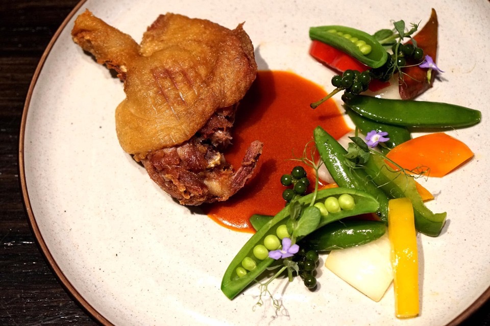 น่องเป็ดไทยขนาดใหญ่ที่นำไปกงฟีจนเนื้อเปื่อย นุ่ม เเค่เขี่ยเบาๆ เนื้อก็เเทบจะหลุดออกจากกระดูกได้เลยทีเดียว แต่ในทางตรงกันข้ามหนังเป็ดกลับทำออกมาได้กรอบมาก ชั้นไขมันใต้หนังไม่มีกลิ่นคาวเลย ทานกับซอสกระเพราที่ราดมาตรงกลาง และผัดผักเคียงขนาบมาด้านข้าง