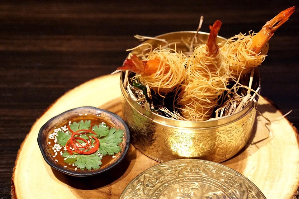 Deep Fried Prawns with Rice Noodles Served with Thai Kumquat Dipping Sauce