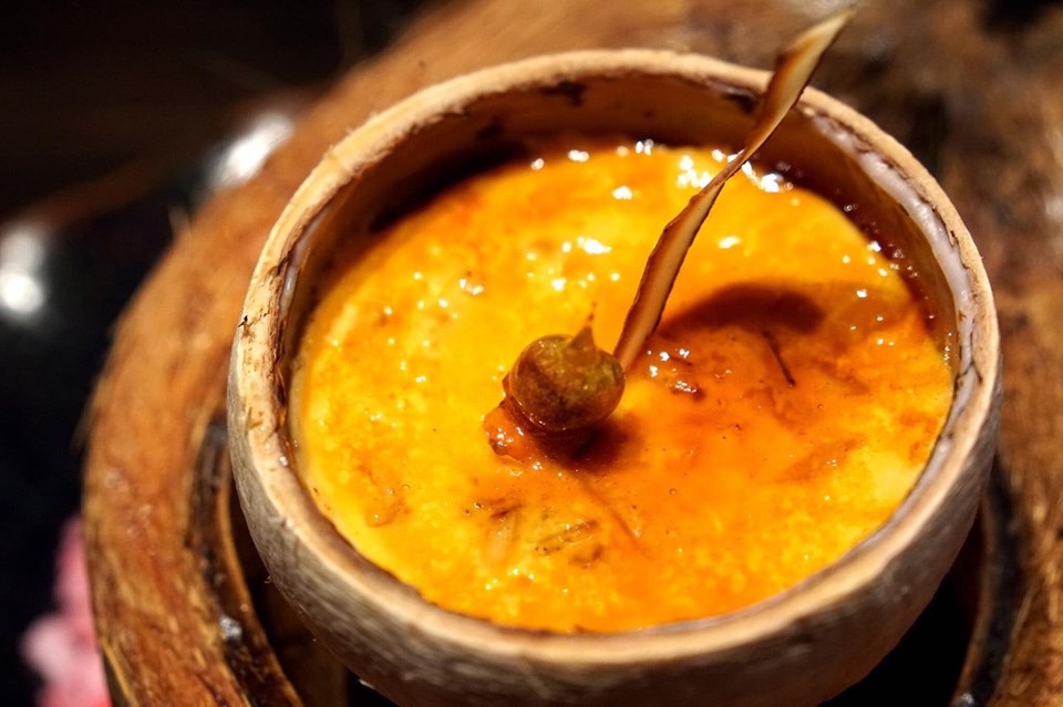 เครมบรูเลมะพร้าวอ่อน เสิร์ฟมาในลูกมะพร้าว เนื้อเนียน มีกลิ่นหอม ข้างในมีเนื้อมะพร้าวให้เคี้ยวตัดเนื้อสัมผัสกับเนื้อเครมบรูเล ผิวน้ำตาลด้านบนมีรสหวานปนขมลงตัวมาก ทอปด้วยมะพร้าวอบกรอบและพิสตาชิโอแคนดี้ จุดเดียวที่อยากให้แก้ไขคือเนื้อเครมบรูเลที่น่าจะทำออกมาให้นุ่มกว่านี้สักนิด (12/20)