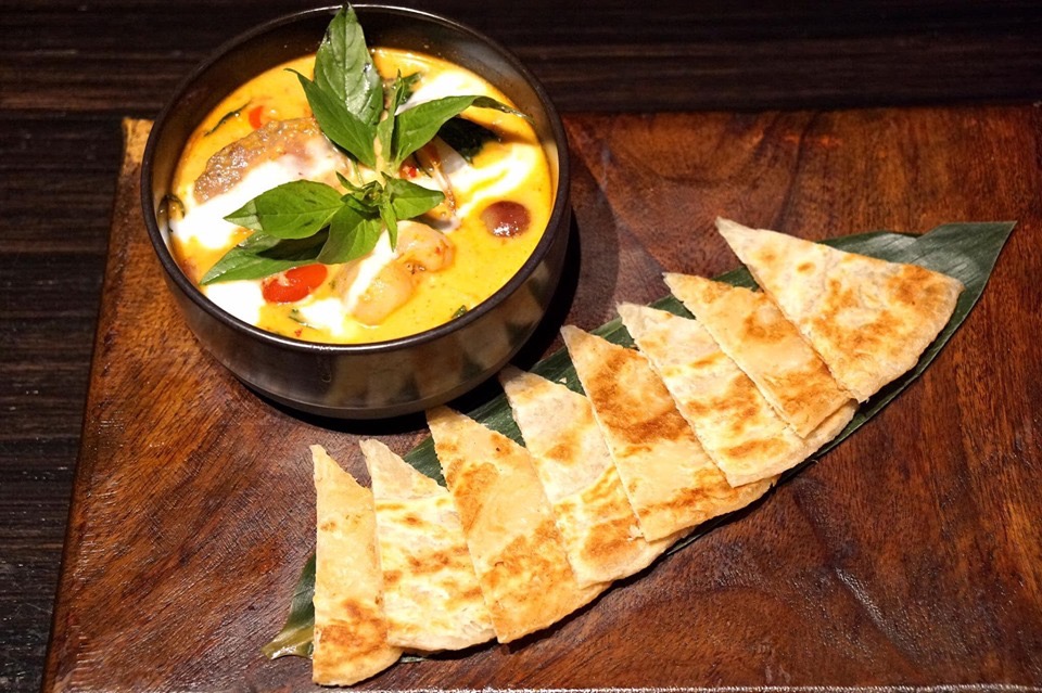 Roasted Duck with Honey, Cherry Tomato, Lychee and Pineapple in Red Curry Served with Roti Canai