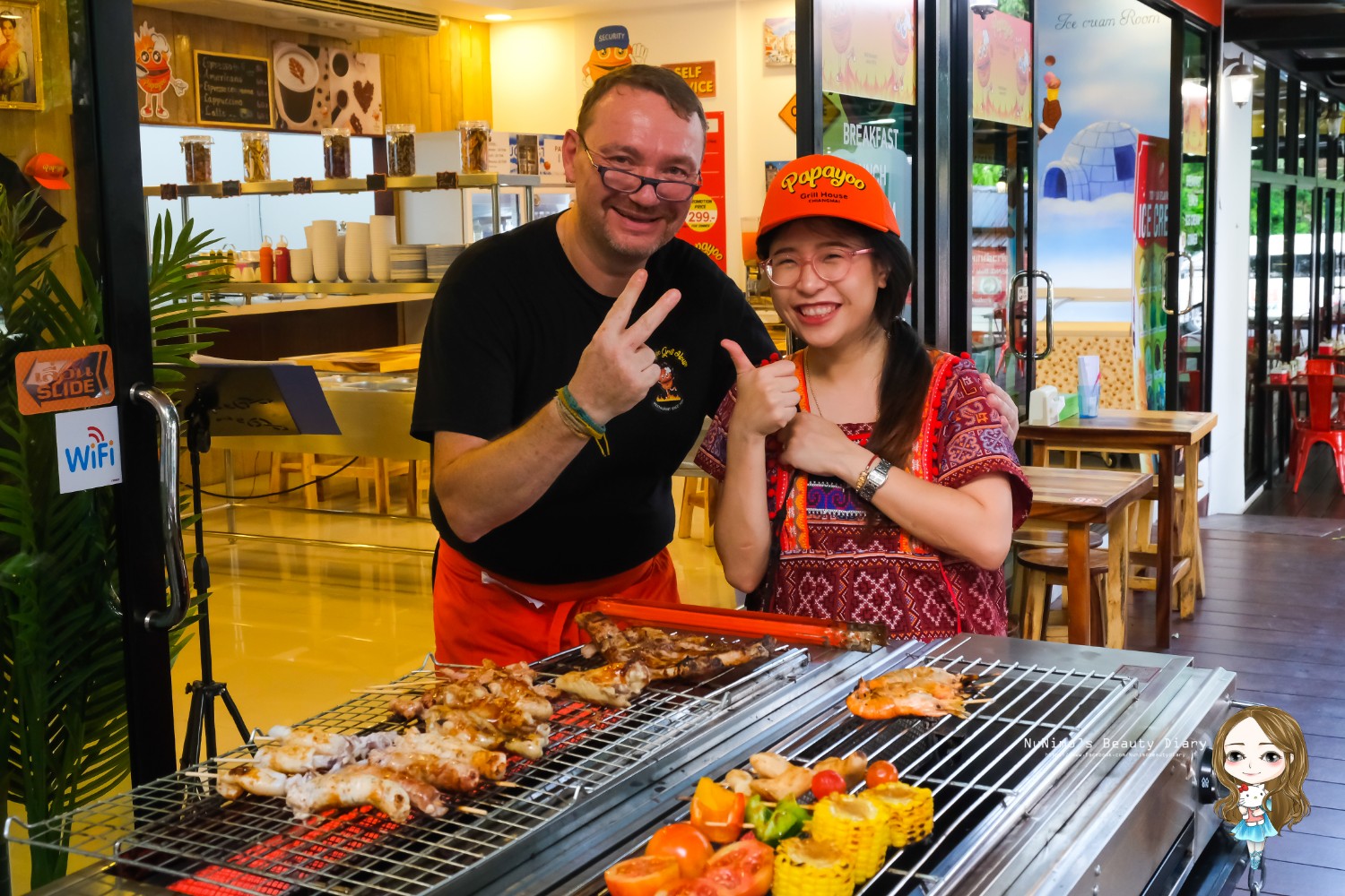 ส่วนไฮไลท์มื้อเย็นก็ต้องที่เลย อาหารย่างฝีมือเชฟ papayoo ย่างกันสดๆหน้าร้าน มาพร้อมซอสสูตรพิเศษ ที่เชฟอธิบายให้ฟังว่ามีส่วนประกอบอะไรบ้างแต่เยอะจนจำไม่ได้ รู้แต่ว่าทาแล้วน่าทาน หอมมาก