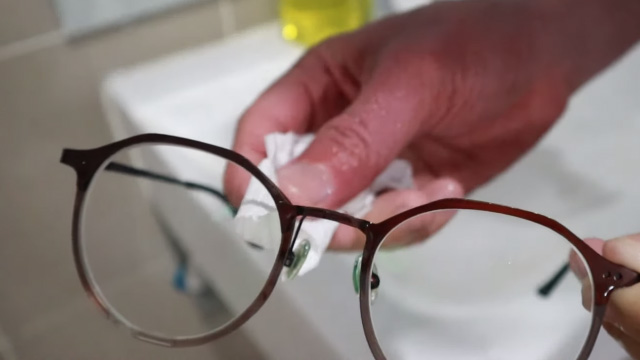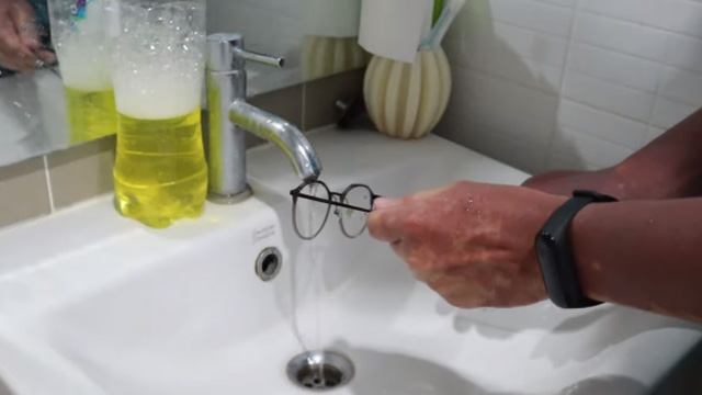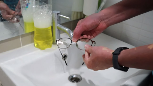 ให้เราเปิดน้ำก๊อกเบาๆ จากนั้นก็ค่อยๆรูดเลนส์แว่นผ่านน้ำ น้ำก๊อกจะดึงน้ำที่อยู่บนเลนส์แว่นออกไปหมด โดยที่เราไม่ต้องเช็ดแว่นเลย
