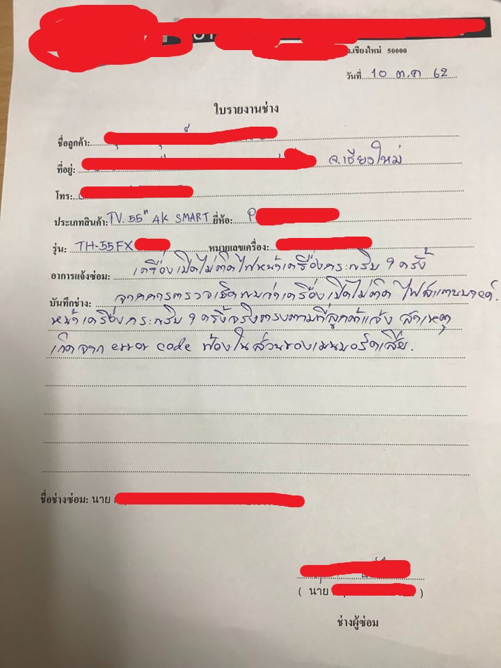 จนสรุปได้ว่า ผมต้องติดต่อไปที่ช่างซ่อมเพื่อมาเชคอาการก่อน แล้วช่างจึงจะออกใบ "รายงานช่าง" เพื่อขอเครมสินค้าใหม่จากทางร้าน