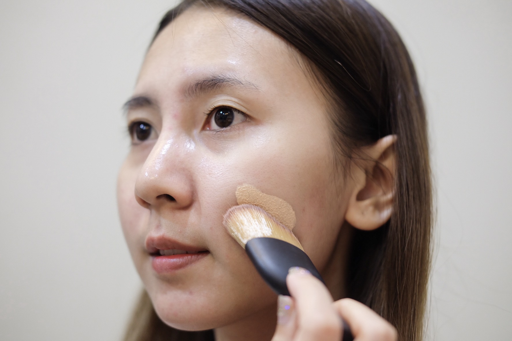 โดยแอมจะใช้แปรงลงรองพื้น Curve brush ในการเกลี่ยรองพื้นให้เรียบเนียน